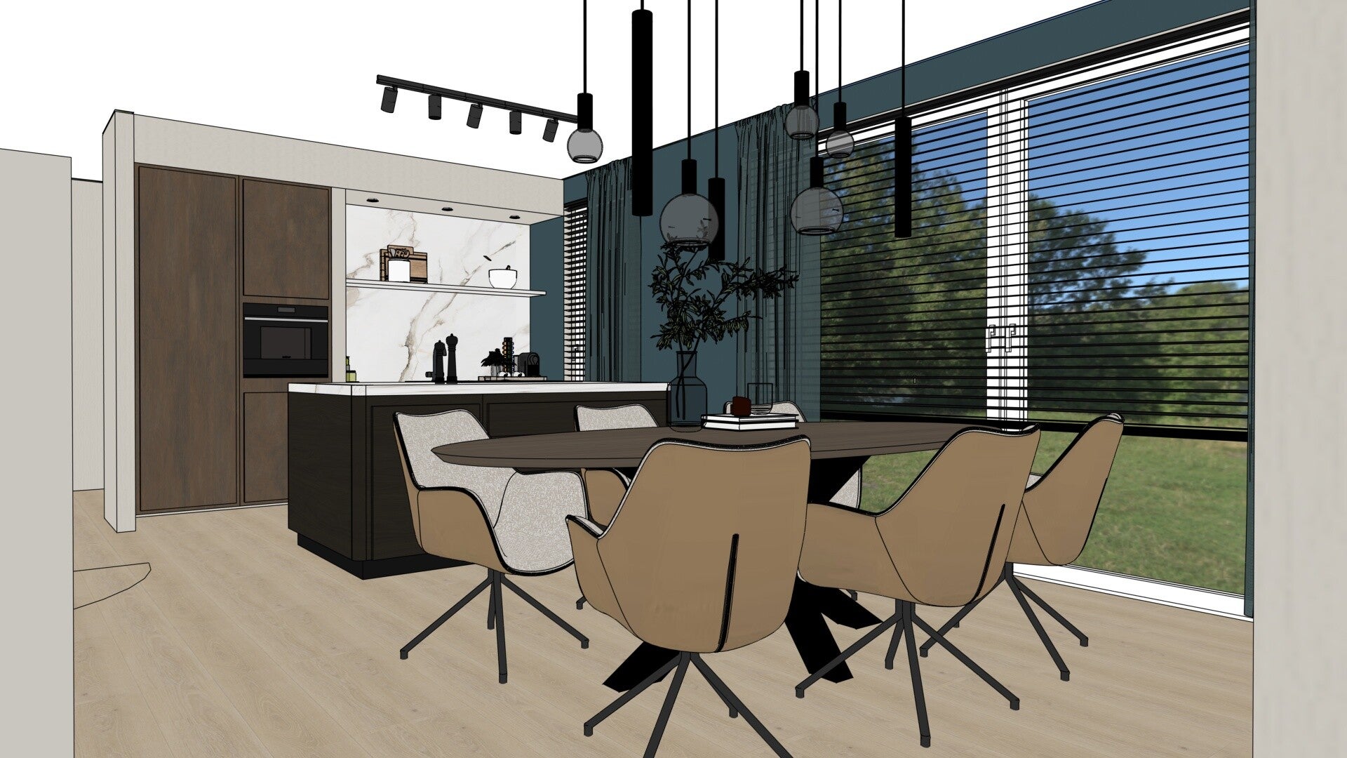 Ze gaven de voorkeur aan een open indeling, met een duidelijke verbinding tussen de leefkeuken en woonkamer, zonder de ruimte te laten aanvoelen als één grote lege vlakte. Materialen moesten natuurlijk aanvoelen, kleuren mochten diep en sfeervol zijn, maar zonder te donker te worden. Er moest ruimte zijn voor comfort, dagelijks gezinsleven én een stijlvol ontvangst van gasten.