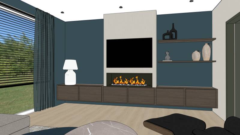 Tijdens het kennismakingsgesprek kwamen koperkleur, cognac en donkerblauw meteen naar voren als favoriete tinten. Deze kleuren vormden de basis voor het interieurconcept: warm, tijdloos en met een subtiel luxegevoel.